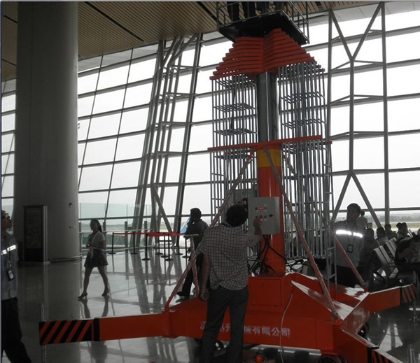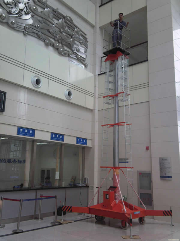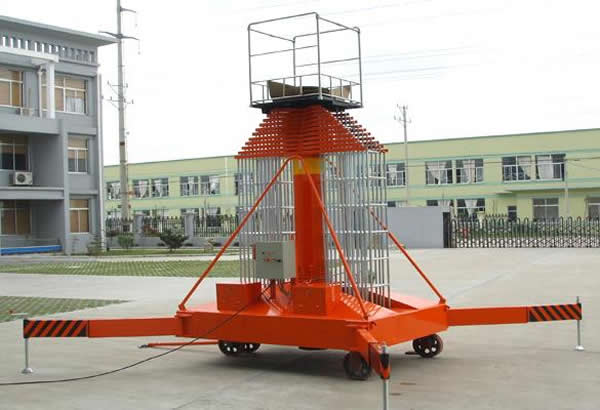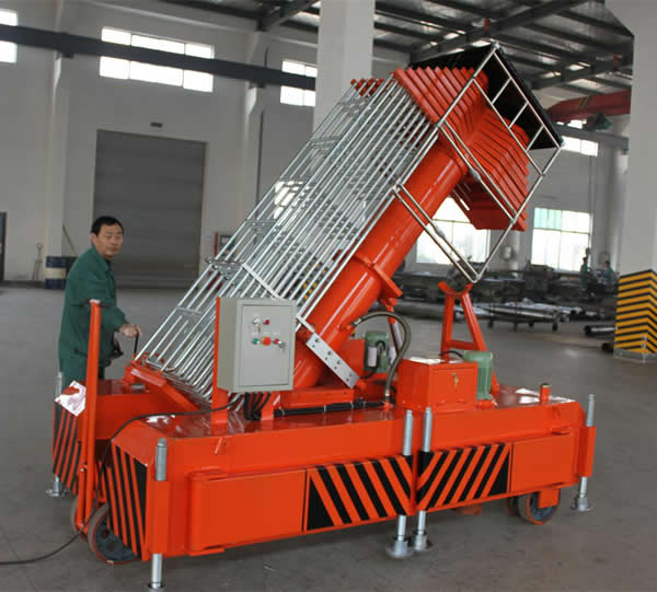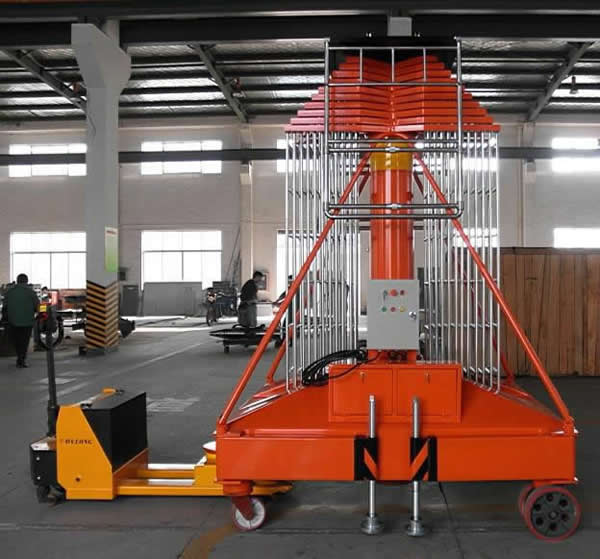 套缸式升降平臺具有設計新穎,體積小,外型美觀,操作維修方便,升降平穩(wěn)等優(yōu)點。整機由平臺、伸縮油缸、單梯式或雙梯式防轉機構、底盤油箱、支腿、行走輪等組成。平臺由伸縮油缸直接頂升,當啟動電機時,由電機帶動齒輪泵供油,油液經(jīng)單向閥及電磁通道輸入油缸,伸縮油缸則逐節(jié)上升,當平臺升到最大高度時,系統(tǒng)壓力也就達到了額定工作壓力。